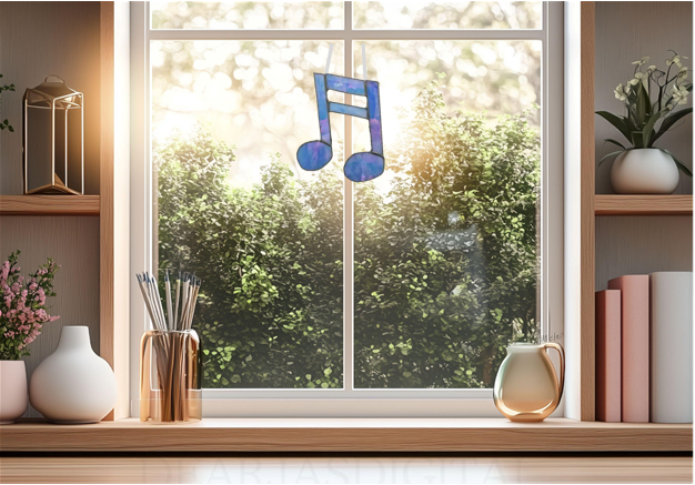 A melody in glass. This handcrafted suncatcher features rich blue and shimmering iridescent tones, echoing the soul of a quiet jazz riff or a peaceful ocean breeze. Measuring 6" x 5", it’s the perfect accent for windows, music rooms, or any space that craves a touch of rhythm and light.