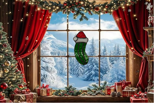 Add a quirky twist to your holiday decor with this handmade stained glass suncatcher featuring the legendary Christmas Pickle! Crafted with rich green glass and a touch of festive sparkle, this 6-inch ornament catches the light like a pickle catches mystery — beautifully and unexpectedly.